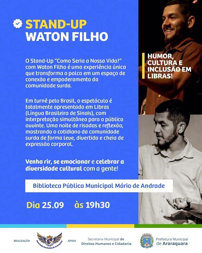 O comediante cearense Waton Filho, reconhecido como o primeiro humorista surdo de stand-up do Brasil, se apresenta no Teatro Municipal de Araraquara nesta quinta-feira, 25 de setembro, às 19h30, dentro da programação do setembro Azul, mês dedicado à luta e às conquistas da comunidade Surda.
