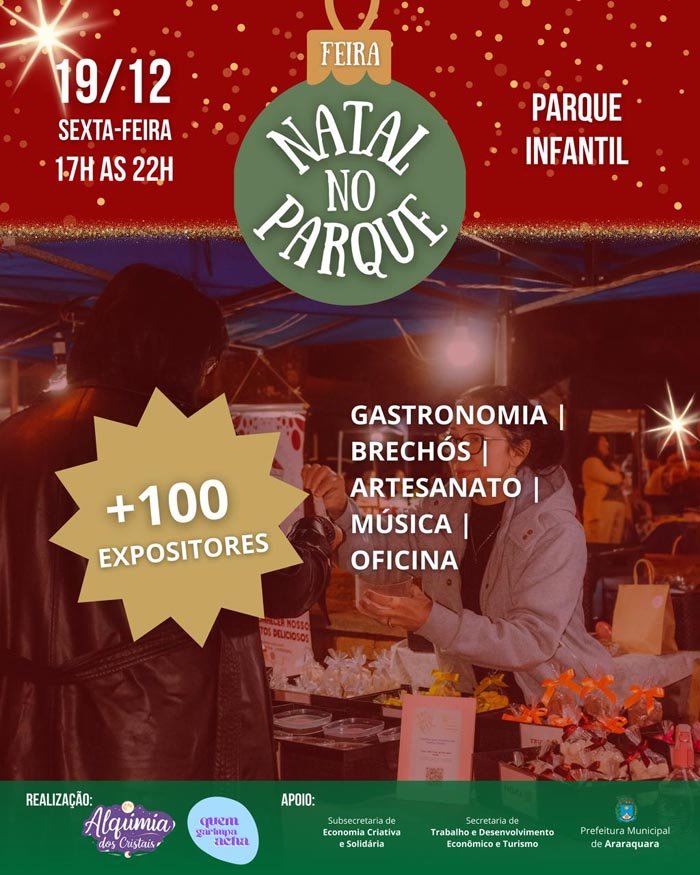 O cheiro de Natal está no ar! Nesta sexta-feira (19) diversos expositores, com artesanato e gastronomia, se reúnem no Parque Infantil para a realização da Feira Natal no Parque. O evento tem início às 17h e segue até às 22h, com mais de 100 expositores, música, oficinas, brechós, arte e praça de alimentação.