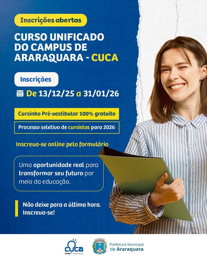 O Curso Unificado do Câmpus de Araraquara (CUCA), parceria entre o Instituto de Química da Unesp e a Prefeitura Municipal de Araraquara, está com inscrições abertas até o dia 31 de janeiro. As 250 vagas, destinadas a estudantes da rede pública, estão distribuídas em três núcleos: Cuca Centro – Manhã (70 vagas), Cuca Centro – Noite (70 vagas) e Cuca Instituto de Química (110 vagas). A seleção segue critérios socioeconômicos e também há reserva de vagas e pontuação adicional para públicos específicos. Para se inscrever, é necessário enviar os documentos e preencher o formulário online, por meio do link: https://docs.google.com/forms/d/e/1FAIpQLSctbEVwTYqYa7OUMMfIE4r6TrREU9oH1CK4Ve4NVGyN4aSXuA/viewform