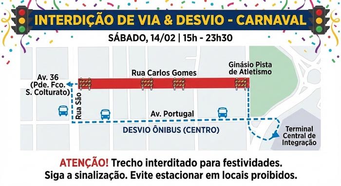 Motoristas e usuários do transporte coletivo devem ficar atentos às mudanças no trânsito neste sábado, dia 14 de fevereiro. A Secretaria Municipal de Assuntos de Segurança e Mobilidade Urbana de Araraquara anunciou a interdição total de um trecho da Rua Carlos Gomes (Rua 6) em razão das festividades carnavalescas programadas para a região.