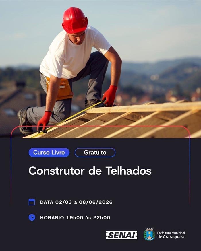 A Prefeitura de Araraquara, em parceria com o Serviço Nacional de Aprendizagem Industrial, está com matrículas abertas para o curso gratuito de Construtor de Telhados, com carga horária de 160 horas.