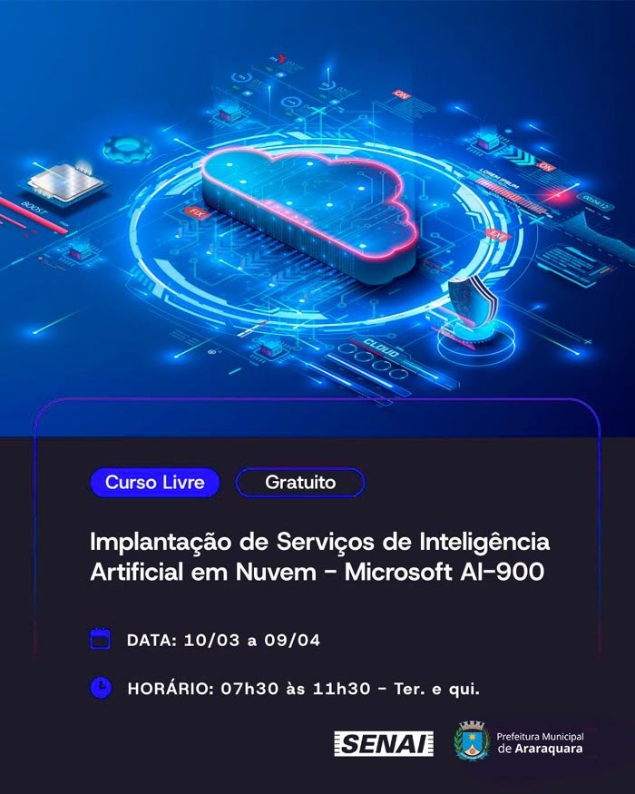 A Prefeitura de Araraquara, em parceria com o Serviço Nacional de Aprendizagem Industrial (SENAI), está com matrículas abertas para o curso Implantação de Serviços de Inteligência Artificial em Nuvem – Microsoft AI-900. A formação é gratuita e voltada a quem já possui conhecimentos básicos de informática, adquiridos em cursos, no trabalho ou de forma autodidata.