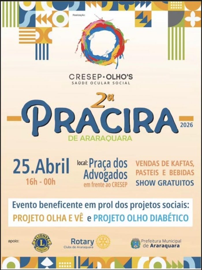 O CRESEP promove, no dia 25 de abril, a 2ª edição da Pracira, na Praça dos Advogados. No local haverá shows de música ao vivo, dança e exposições gratuitos, além da venda de kafta, pastéis e bebidas. A organização conta com o apoio da Prefeitura de Araraquara, do Lions Clube e do Rotary Clube.