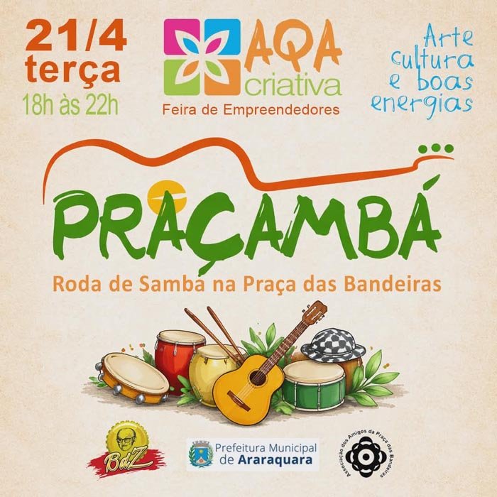O feriado de Tiradentes, na próxima terça-feira (21), contará com muita animação na Praça das Bandeiras, com a realização da Feira Aqa Criativa que apresenta o projeto Praçambá com o grupo SambaZinho.