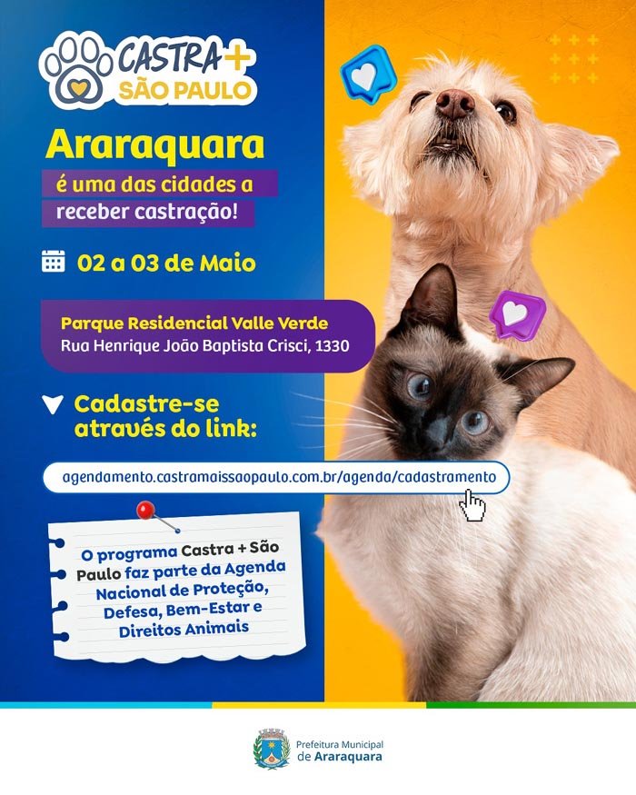 O programa de castração pública e gratuita de cães e gatos no estado de São Paulo, o Castra+São Paulo, iniciativa do deputado federal Delegado Bruno Lima, estará em Araraquara nos dias 2 e 3 de maio. O ponto de atendimento será montado no Valle Verde. As vagas são limitadas e os tutores que tiverem interesse precisam preencher um cadastro, disponível no link: https://agendamento.castramaissaopaulo.com.br/agenda/cadastramento
