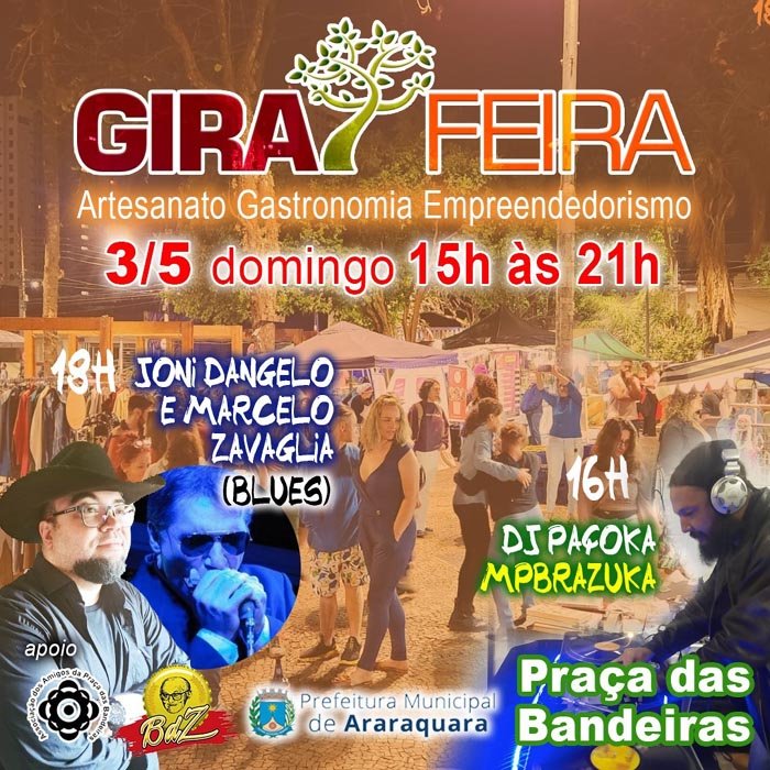 Neste domingo, 3 de maio, das 16h às 21h, o GiraFeira estará de volta na Praça das Bandeiras, na região central, com realização do coletivo GiraFeira e apoio da Secretaria Municipal de Desenvolvimento Econômico, via Subsecretaria do Trabalho e da Economia Criativa e Solidária e da Associação Amigos da Praça das Bandeiras.