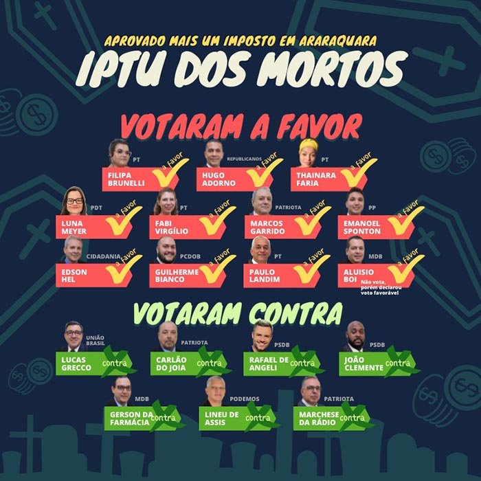 O projeto de lei - PLC 3/2022 - que institui um preço público (uma espécie de cobrança) anual do túmulo da sua família, foi aprovado pela câmara dos vereadores de Araraquara.