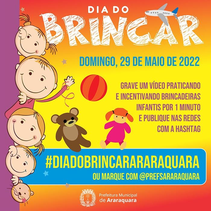 O Dia Municipal do Brincar em Araraquara terá sua edição 2022 realizada de forma online. A ação será dia 29 de maio, e será organizada nas redes sociais, permitindo a participação de todos os interessados em brincadeiras infantis.