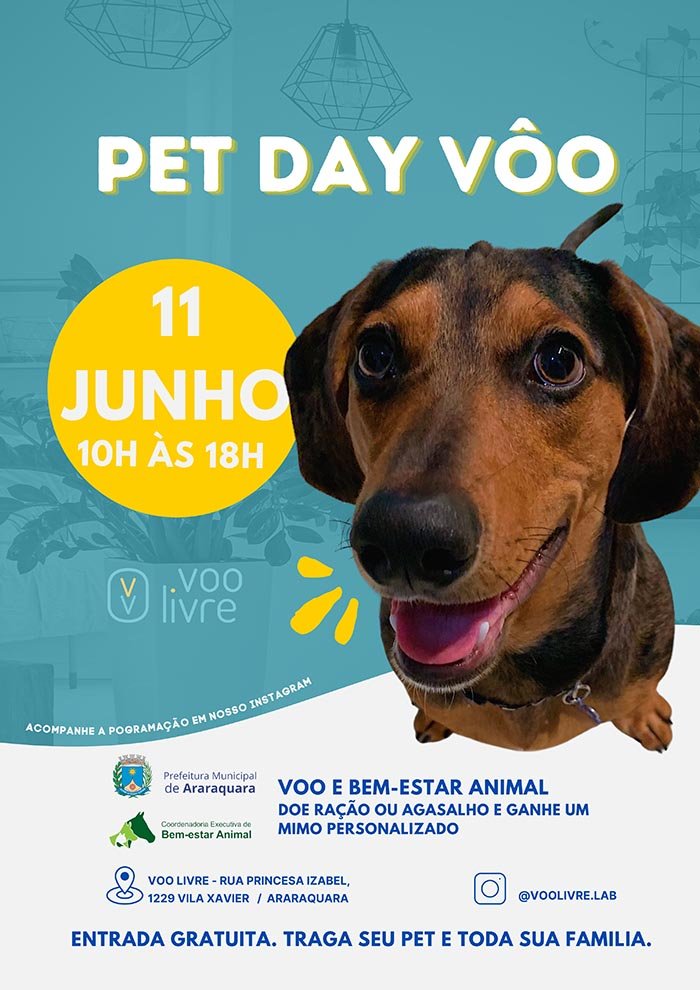 A Prefeitura de Araraquara, por meio da Coordenadoria de Bem-Estar Animal, participará da Pet Day Voo, feira voltada para o segmento de animais de estimação, que será realizada neste sábado (11), das 10h às 18h, no espaço planejado Voo Livre, que fica na Rua Princesa Izabel, 1229, Vila Xavier.