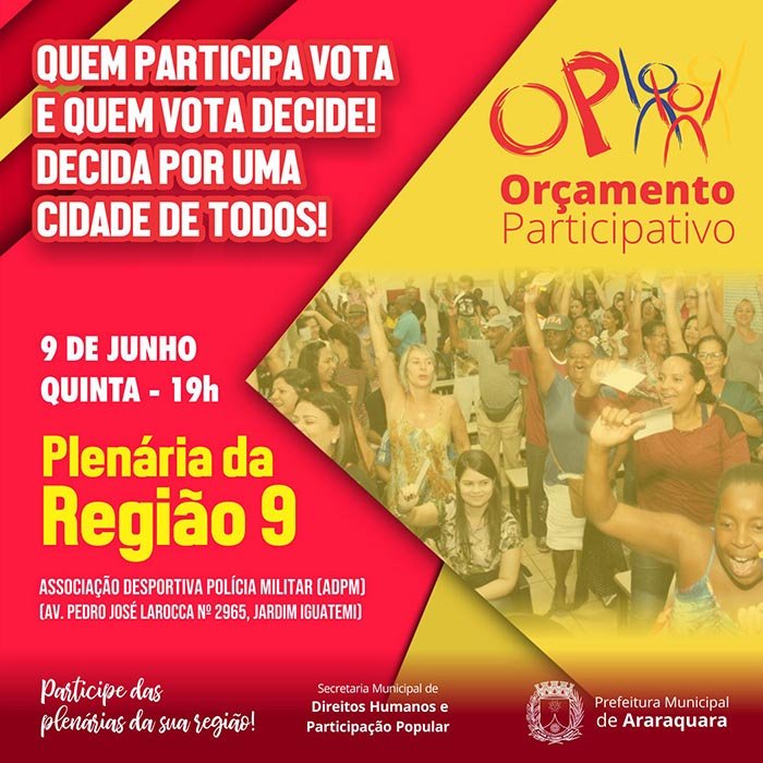 Nesta quinta-feira (9), a Associação Desportiva Polícia Militar (ADPM), que fica na Av. Pedro José Larocca nº 2965, Jardim Iguatemi, receberá a Plenária da Região 9 do Orçamento Participativo (OP), programa que permite à população opinar sobre onde serão investidos os orçamentos públicos. O encontro, aberto ao público, está marcado para acontecer às 19h.