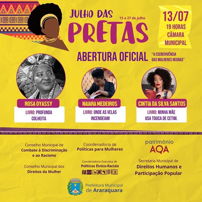 A Prefeitura de Araraquara, por meio da Secretaria Municipal de Direitos Humanos e Participação Popular, Coordenadoria de Políticas Étnico-Raciais e Coordenadoria de Políticas para Mulheres, inicia nesta quarta-feira (13) a programação da edição 2022 do "Julho das Pretas", que neste ano será presencial, com o objetivo de visibilizar a luta de mulheres que diuturnamente são apagadas da história e têm seus direitos violados. No ano passado, por conta do agravamento da pandemia da Covid-19, os eventos foram realizados de forma online. A agenda também é inspirada no fato de julho ser o mês em que é comemorado o Dia Internacional da Mulher Negra Latino Americana e Caribenha (dia 25).