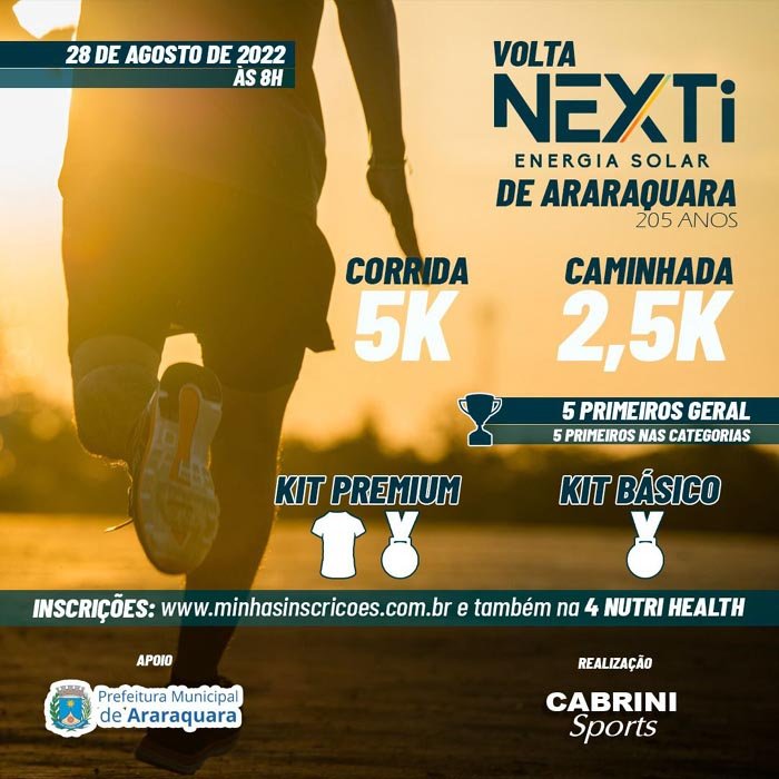 Já estão abertas as inscrições para a Volta Nexti de Araraquara, prova de rua que contará com corrida e caminhada com o propósito de comemorar o aniversário de 205 anos de Araraquara. O evento, que é organizado pela Cabrini Sports com apoio da Prefeitura de Araraquara, será realizado no dia 28 de agosto, domingo, com a largada marcada para às 8h, na Rua Ettori Berti, próximo ao Residencial Village Damha. Com vagas limitadas, a corrida será de 5 quilômetros e a caminhada terá o percurso de 2,5 quilômetros.