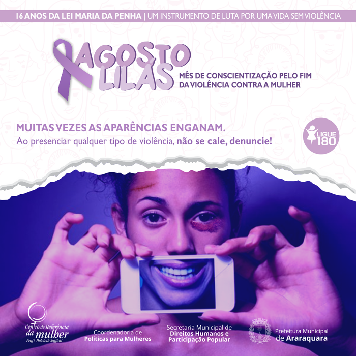 A Prefeitura Municipal de Araraquara, por meio da Coordenadoria Executiva de Políticas para Mulheres, realiza na cidade o “Agosto Lilás”, campanha de enfrentamento à violência doméstica e familiar contra a mulher, instituída nacionalmente em celebração ao aniversário de sanção da Lei Maria da Penha (Lei nº 11.340, de 7 de agosto de 2006), que este ano completa 16 anos. O propósito é sensibilizar e conscientizar a sociedade sobre o fim da violência contra a mulher e divulgar os serviços especializados da rede de atendimento à mulher em situação de violência e as formas de denúncia.