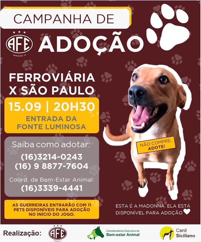Nesta quinta-feira (15), a Ferroviária, em parceria com a Prefeitura Municipal de Araraquara, Coordenadoria de Bem-Estar Animal e o Canil Siciliano, realizarão uma campanha de adoção de animais na Fonte Luminosa. à princípio, a ação seria realizada no última quarta-feira (7), no jogo contra o São José, porém o tempo chuvoso ocasionou seu adiamento.
