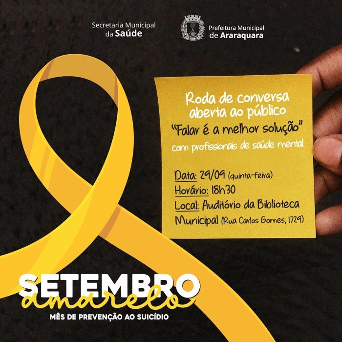 Como parte da programação do “Setembro Amarelo”, campanha realizada durante o mês que é dedicado à prevenção do suicídio, a Prefeitura de Araraquara, por meio da Secretaria Municipal de Saúde, através das unidades de Saúde Mental, agendou para o próximo dia 29 de setembro, às 18h30, na Biblioteca Municipal, roda de conversa aberta a toda população.