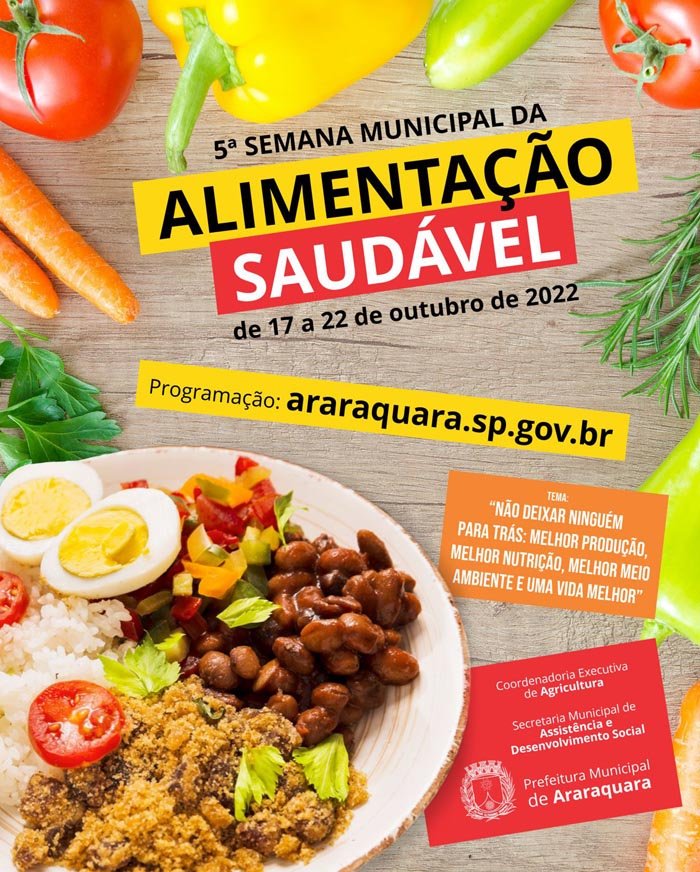 A Prefeitura de Araraquara, por meio da Coordenadoria de Segurança Alimentar, ligada à Secretaria de Assistência e Desenvolvimento Social, planeja os últimos detalhes da 5ª Semana da Alimentação Saudável, que foi instituída por meio da Lei Municipal nº 9024, de 11 de julho de 2017, incluindo a comemoração do Dia Mundial da Alimentação no dia 16 de outubro. Neste ano, a programação será realizada entre os dias 17 e 22 de outubro e o tema será “Não deixar ninguém para trás: melhor produção, melhor nutrição, melhor meio ambiente e uma vida melhor”.