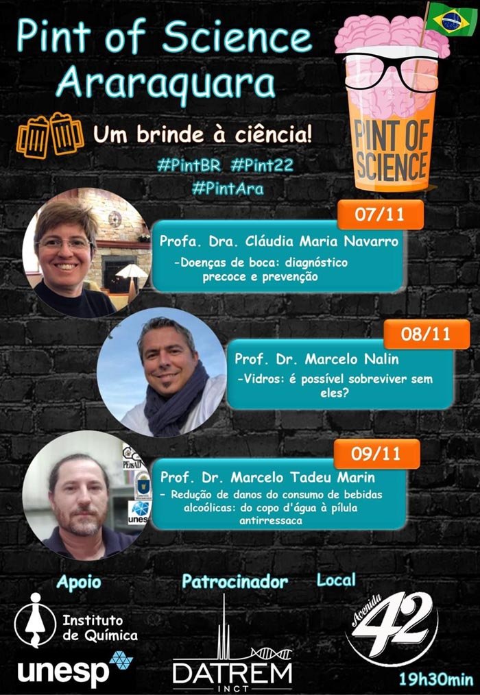 O festival de ciências “Pint of Science 2022” teve início nesta segunda-feira (7) com a palestra “Doenças de boca: diagnóstico precoce e prevenção”, da Profa. Dra. Cláudia Maria Navarro. O evento tem apoio do Instituto de Química da Unesp de Araraquara e conta com patrocínio do INCT - DATREM (Instituto Nacional de Tecnologias Alternativas para Detecção, Avaliação Toxicológica e Remoção de Contaminantes Emergentes e Radioativos).
