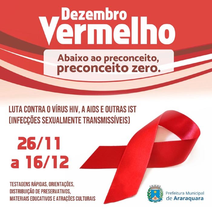 A Prefeitura de Araraquara prepara uma série de atividades para o "Dezembro Vermelho", campanha instituída pela Lei nº 13.504/2017 e que marca uma grande mobilização nacional na luta contra o vírus HIV, a Aids e outras IST (infecções sexualmente transmissíveis), chamando a atenção para a prevenção, a assistência e a proteção dos direitos das pessoas infectadas com o HIV.