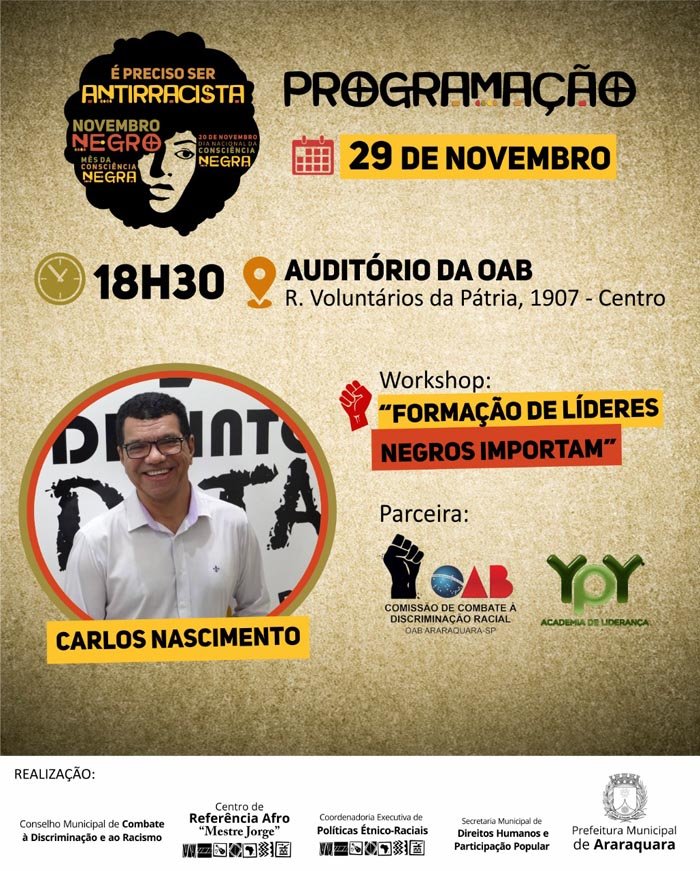 Nesta terça-feira (29), o auditório da Ordem dos Advogados do Brasil (OAB) Araraquara (Rua Voluntários da Pátria, 1907) sediará o workshop "Formação de Líderes Negros Importam", atividade que integra a agenda do Novembro Negro, programação desenvolvida em alusão ao Mês da Consciência Negra e promovida pela Prefeitura de Araraquara por meio da Coordenadoria Municipal de Políticas Étnico-Raciais. Neste evento, a organização conta com a parceria da Comissão de Combate à Discriminação da OAB e da Empresa YPY Soluções.
