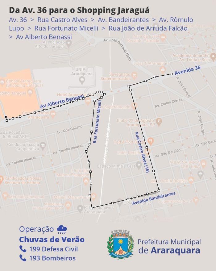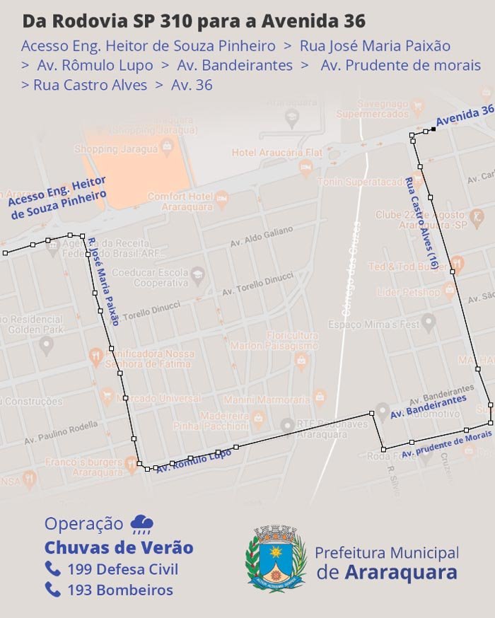 A Prefeitura de Araraquara, por meio das secretarias municipais dos Assuntos de Cooperação de segurança Pública e do Trânsito, Transportes e Mobilidade Urbana, informa que, devido à cratera aberta na Avenida 36 pelas fortes chuvas que atingiram a cidade na última quarta-feira (29) e a necessidade de interdição do tráfego de veículos no local, foram traçados desvios naquela região para possibilitar o acesso ao bairro Vale do Sol, ao Shopping Jaraguá e também para quem chega na cidade pela rodovia Washington Luiz.