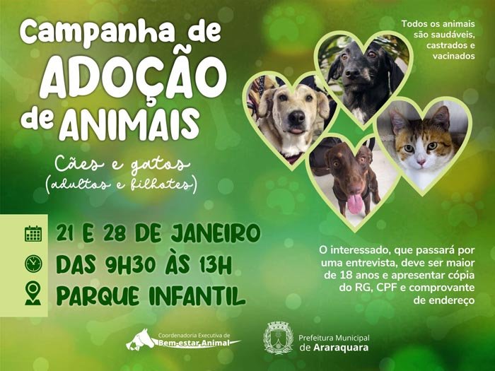 Nos dois próximos sábados, dias 21 e 28, das 9h30 às 13h, será realizada a Campanha de Adoção de Animais no Centro de Adoção Permanente Cão Gabriel, localizado no Parque Infantil. A campanha é realizada pela Prefeitura de Araraquara por meio da Coordenadoria de Bem-Estar Animal da Prefeitura. Vale salientar que, em caso de chuva, as atividades serão canceladas.