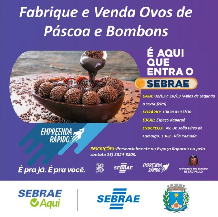 Estão abertas as inscrições para o curso “Fabrique e venda ovos de Páscoa e bombons”, realizado em uma parceria entre a Prefeitura de Araraquara e o Sebrae. A atividade é mais um curso oferecido pelo programa “Empreenda Rápido” do Sebrae, que tem o objetivo de incentivar a gerar renda com seu próprio negócio.