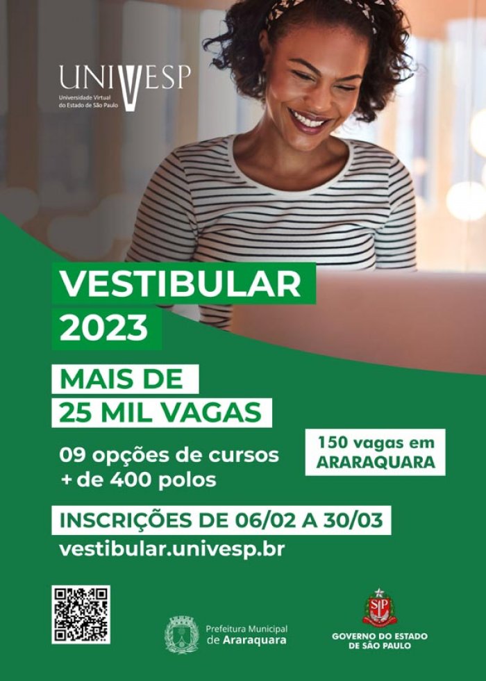 O Polo acadêmico de ensino superior a distância da Universidade Virtual do Estado de São Paulo (Polo UNIVESP Araraquara) está com inscrições abertas desde a última segunda-feira (6). Os interessados têm até o dia 30 de março para efetuar a inscrição de maneira digital, com valor de R$ 51,75 (lembrando que a Universidade Pública é pública e os curso gratuitos). Para participar, independentemente de idade, basta ter concluído o ensino médio ou com o término previsto até o período da matrícula. No preenchimento da ficha de inscrição, os candidatos devem cumprir todas as etapas previstas, responder o questionário socioeconômico, indicar o CPF e seus dados pessoais.
