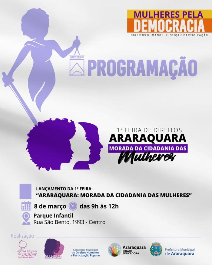 Nesta quarta-feira, 8 de março, será realizada a "Feira de Direitos - Araraquara, morada da cidadania das mulheres", no Parque Infantil, das 9 às 12 horas. O evento reunirá diversos atendimentos com serviços públicos voltados para o público feminino. A atividade integra a programação do Dia Internacional de Luta das Mulheres, promovida pela Prefeitura de Araraquara, por meio da Coordenadoria Executiva de Políticas para Mulheres, ligada à Secretaria Municipal de Direitos Humanos e Participação Popular.