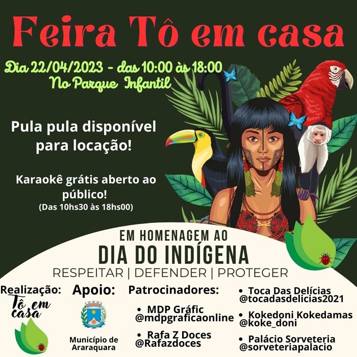 Tô em Casa - A Feira Tô em Casa realiza uma edição em homenagem ao Dia do Indígena, das 10h às 18 horas no Parque Infantil, neste sábado (22). O público poderá apreciar os trabalhos de empreendedores e artesãos da cidade e região, com uma diversidade de produtos, que passam por: decoração, culinária, beleza, brinquedos, artesanato, moda, acessórios, produtos ecológicos, veganos e gastronomia.