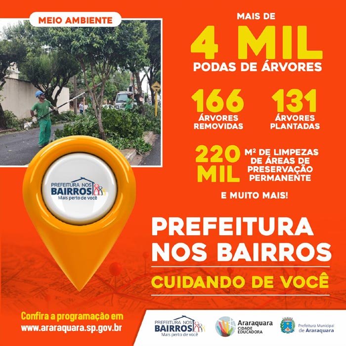 O secretário de Meio Ambiente e Sustentabilidade, José Carlos Porsani, falou sobre o trabalho de sua pasta dentro do programa. "O programa Prefeitura nos Bairros tem nos permitido que as demandas da população cheguem com mais rapidez e, por consequência, sejam atendidas de forma mais célere e efetiva, em virtude da aproximação da população com os serviços da Prefeitura. Nesse sentido, desde o início do programa, 220 mil metros quadrados de Áreas de Preservação Permanente foram limpas, conseguimos fazer a manutenção das áreas verdes de praças, canteiros centrais e dispositivos viários, totalizando 90 mil metros quadrados de área, além de 4.142 árvores podadas, 166 removidas e realizamos o plantio de 131 mudas", revelou.