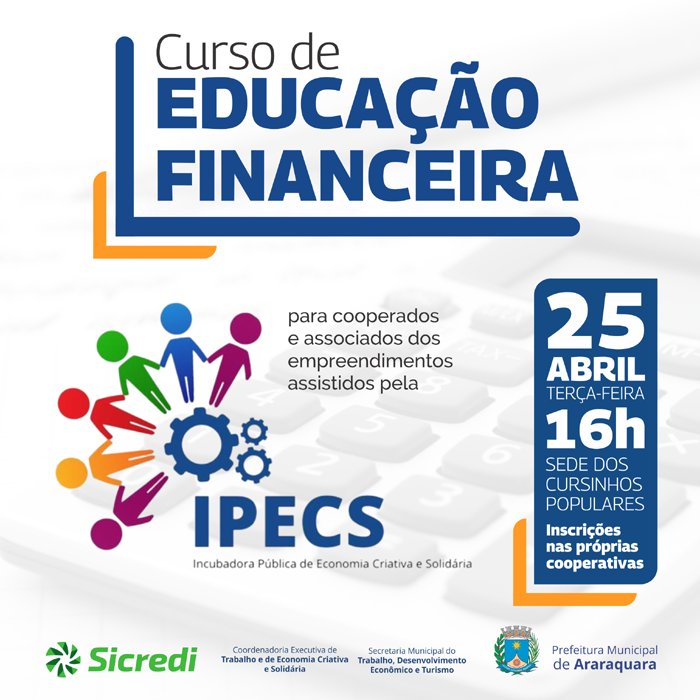 A Coordenadoria Executiva do Trabalho e de Economia Criativa e Solidária, vinculada à Secretaria do Trabalho, Desenvolvimento Econômico e Turismo, através da Incubadora Pública de Economia Criativa e Solidária de Araraquara (IPECS), em parceria com o Sicredi Araraquara, oferecerá um curso de educação financeira aos cooperados e associados dos empreendimentos assistidos.