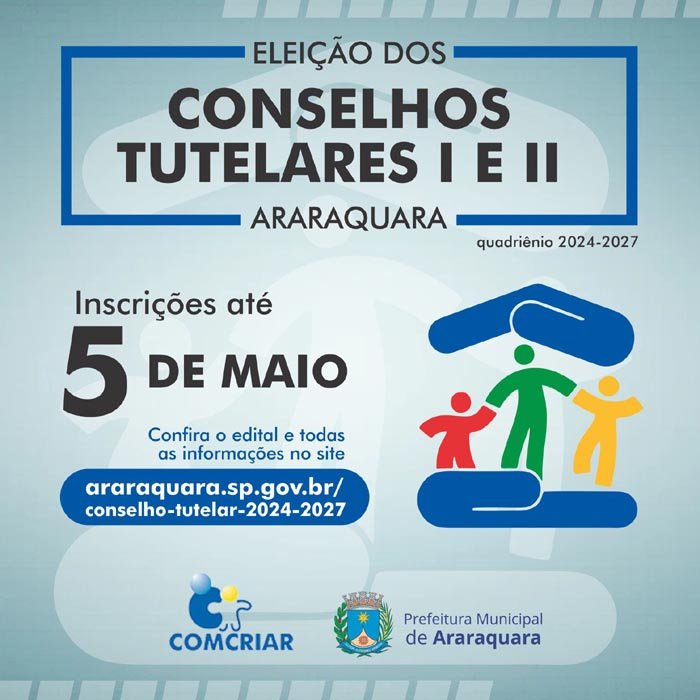Se encerram nesta sexta-feira, 5 de maio, as inscrições para o Processo Eleitoral dos Conselhos Tutelares I e II do Município de Araraquara. O edital elaborado pelo Conselho Municipal dos Direitos da Criança e do Adolescente de Araraquara (COMCRIAR), que contém todas as informações sobre a eleição dos membros que atuarão no quadriênio 2024-2027, pode ser conferido nos sites da Prefeitura de Araraquara (araraquara.sp.gov.br/conselho-tutelar-2024-2027) e do próprio COMCRIAR (www.cmdcaararaquara.com.br).