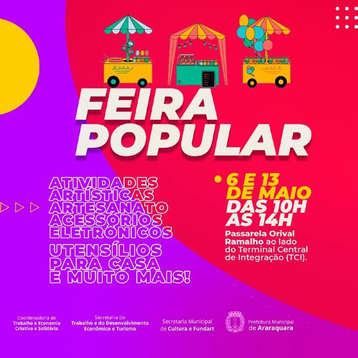 Tudo organizado para a abertura da Feira Popular, instalada na Passarela Orival Ramalho, ao lado do Terminal Central de Integração (TCI), neste sábado, 06 de maio. A Prefeitura de Araraquara, por meio da Coordenadoria do Trabalho e de Economia Criativa e Solidária, vinculado à secretaria municipal do Trabalho, Desenvolvimento Econômico e Turismo, lembra que a música ao vivo será o destaque da inauguração na região central de Araraquara.