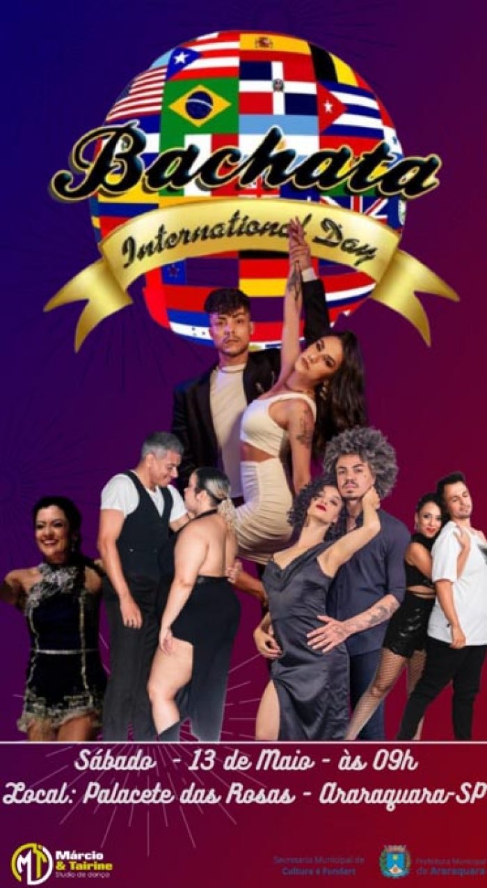A Dança de Salão é destaque na programação cultural de Araraquara neste sábado, 13 de maio, com o “International Bachata Day” – evento criado em 2012, no Rio Grande do Sul, e que alia a cultura e a dança à solidariedade. O “International Bachata Day” será realizado pelo Studio de Dança Marcio & Tairine em parceria com a Prefeitura Municipal de Araraquara, Secretaria de Cultura e Fundart na região central de Araraquara. As atividades acontecem na região central, no Palacete das Rosas Paulo A.C. Silva.