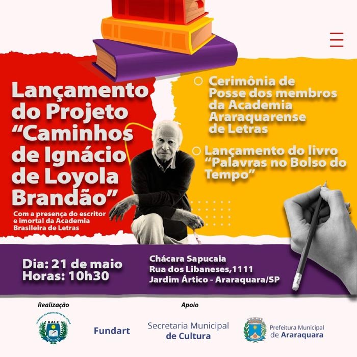 Um novo projeto chega a Araraquara para consolidar a trajetória do escritor araraquarense Ignácio de Loyola Brandão: “Caminhos de Ignácio de Loyola Brandão” - uma realização da Prefeitura de Araraquara, por meio da Secretaria Municipal da Cultura - Fundart e Coordenadoria de Acervos e Patrimônio Histórico, com iniciativa da Academia Araraquarense de Letras. O lançamento acontece neste domingo, 21 de maio, após o empossamento dos novos membros da Academia Araraquarense de Letras, a partir das 10h30, na Chácara Sapucaia, para convidados e interessados em geral.
