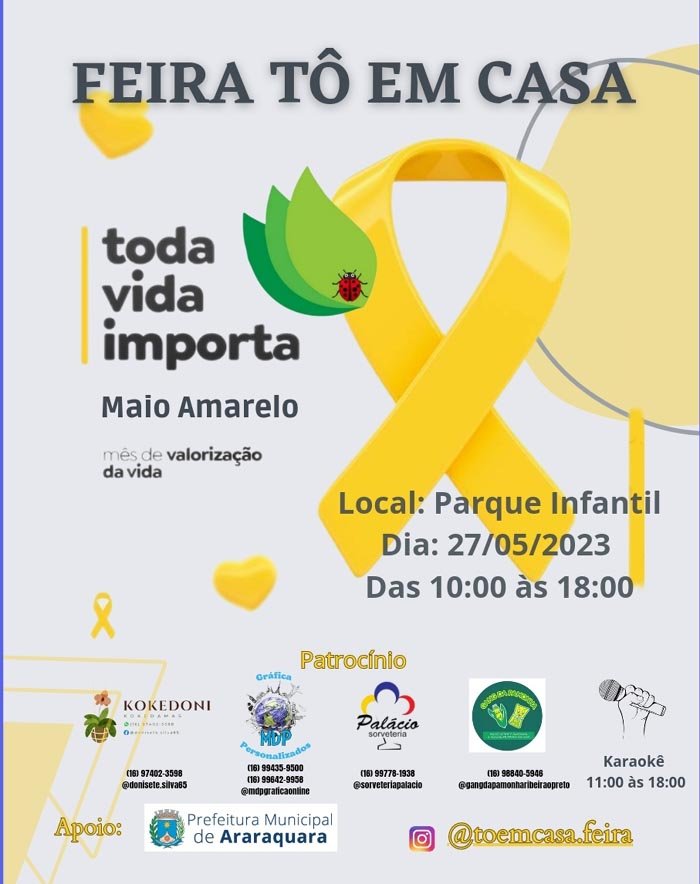 A Feira Tô em Casa é destaque na programação do final de semana, apresentando o tema “Maio Amarelo: Conscientização para Segurança do Trânsito” no Parque Infantil, neste sábado (27), das 10h às 18 horas.