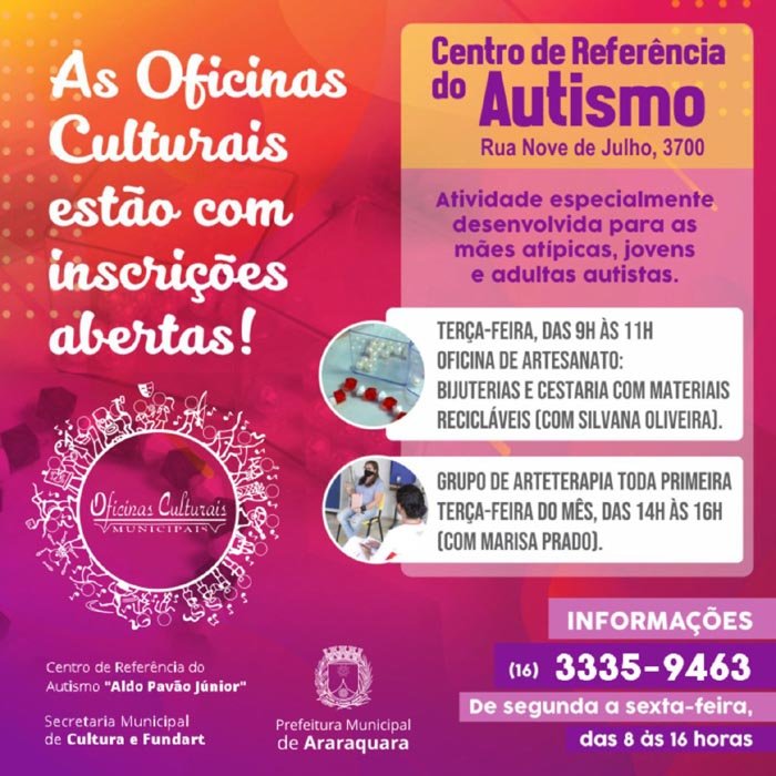 O Programa Oficinas Culturais Municipais chega ao Centro de Referência do Autismo Aldo Pavão. Na próxima semana, a partir de terça-feira, 30 de maio, as atividades do programa realizado pela Secretaria Municipal da Cultura e Fundart serão iniciadas no local, gratuitamente. As inscrições estão abertas.