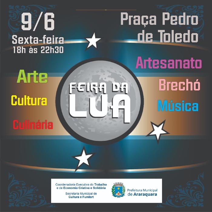 A Feira da Lua, realizada pelo Coletivo Pôr do Sol, terá artesanato, culinária, brechó e desapego, além de música. A edição será realizada na Praça Pedro de Toledo, localizada na Av. Portugal, entre as ruas Carlos Gomes e Itália / ruas 6 e 7, no Centro de Araraquara.
