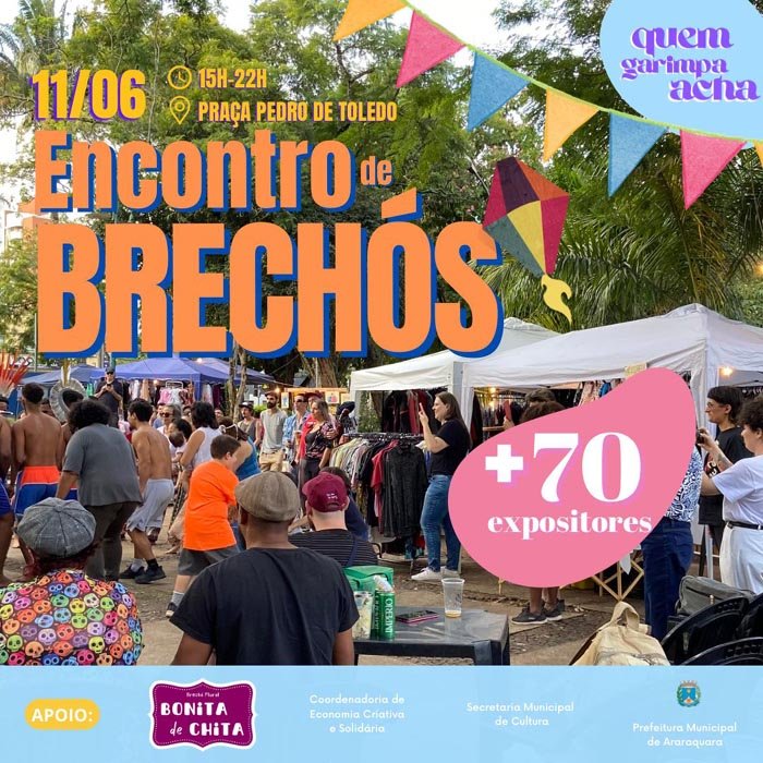O Encontro de Brechós, sucesso na Praça Pedro de Toledo, está de volta neste domingo. O Coletivo Quem Garimpa Acha promove o encontro das 15h às 22 horas, com o tema Festa Junina e com comidas típicas, e mais aproximadamente 70 expositores com brechó, gastronomia e artesanato. Esta feira de brechós e moda circular e sustentável de Araraquara traz a oportunidade de se vestir e presentear de forma mais sustentável, com expositores que destacam os brechós e as marcas de upcycling de Araraquara e região. A Praça Pedro de Toledo está localizada na Av. Portugal, entre as ruas Carlos Gomes e Itália / ruas 6 e 7, no Centro de Araraquara.