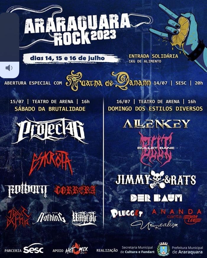 A abertura do Araraquara Rock será realizada no Sesc Araraquara , no dia 14 de julho, nesta sexta-feira (14), às 20 horas, com Tuatha de Danann – banda de folk metal, de Varginha, conhecida pelos ritmos e letras inspiradas na mitologia céltica. No sábado e domingo (15 e 16) os shows serão realizados no Teatro de Arena Prefeito Benedito de Oliveira, na Vila Melhado, com a abertura dos portões às 16 horas.