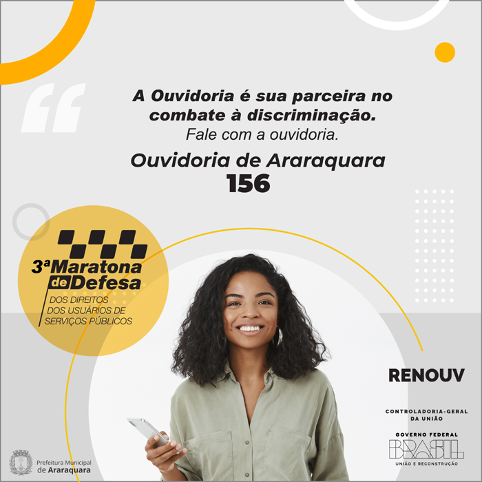 A Prefeitura de Araraquara, por meio da Ouvidoria Geral do Município, participa da III Maratona de Defesa dos Direitos dos Usuários de Serviços Públicos, uma promoção da Rede Nacional de Ouvidorias. Entre os dias 10 de julho e 10 de agosto, serão divulgadas nas redes sociais da Prefeitura (Facebook e Instagram) peças para promover o conhecimento dos usuários acerca de seus direitos e do papel das ouvidorias como instrumento para salvaguardá-los. A campanha deste ano marca os 6 anos da Lei de Proteção e Defesa do Usuário do Serviço Público (Lei 13.460/2017) e traz como tema a "Discriminação no serviço público: não se cale".