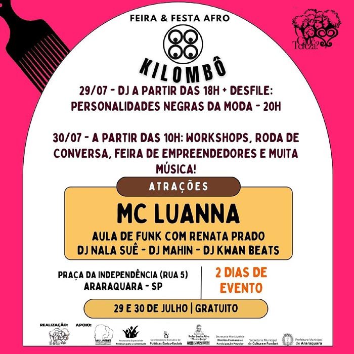 O Coletivo Cadê Tereza, fundado ao final de 2016, realizará nos dias 29 e 30 de julho a 4ª edição da Feira e Festa Afro, chamada Kilombô. Formado por cinco mulheres negras de Araraquara, o objetivo da festa é reforçar a união da população preta em prol de sua emancipação, portanto, toda a produção é 100% formada por mulheres e homens negros da cidade, que se uniram ao Coletivo para auxiliar na organização.