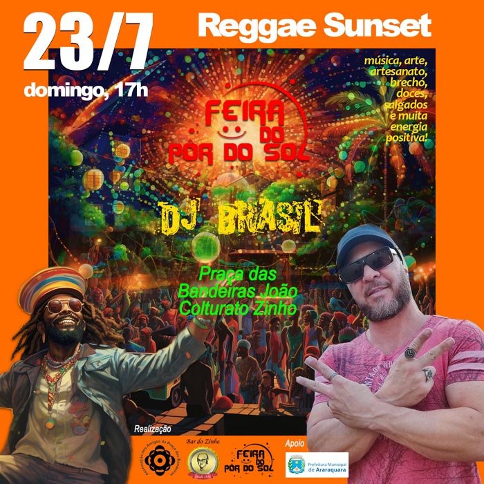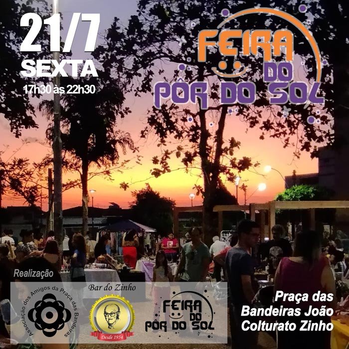 Música também agita a festa: o DJ Brasil anima a praça com discotecagem reggae e boas vibrações, com o “reggae do pôr do sol”. O evento é uma realização da Associação dos Amigos da Praça das Bandeiras em parceria com o Coletivo do Pôr do Sol e Bar do Zinho, e apoio da Secretaria Municipal do Meio Ambiente.