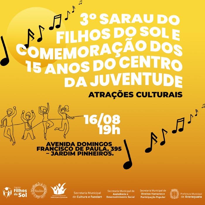 No dia 16 de agosto, próxima quarta-feira, a partir das 19h, o Centro da Juventude (Avenida Domingos Francisco de Paula, 395, Jardim Pinheiros) receberá o 3° Sarau do Filhos do Sol, que também marcará a comemoração pelos 15 anos do Centro da Juventude de Araraquara. O encontro, que terá entrada gratuita ao público, será promovido pela Prefeitura de Araraquara por meio da Assessoria de Políticas para a Juventude, integrante da Secretaria de Direitos Humanos e Participação Popular, além da Secretaria de Assistência e Desenvolvimento Social e Oficinas Culturais.