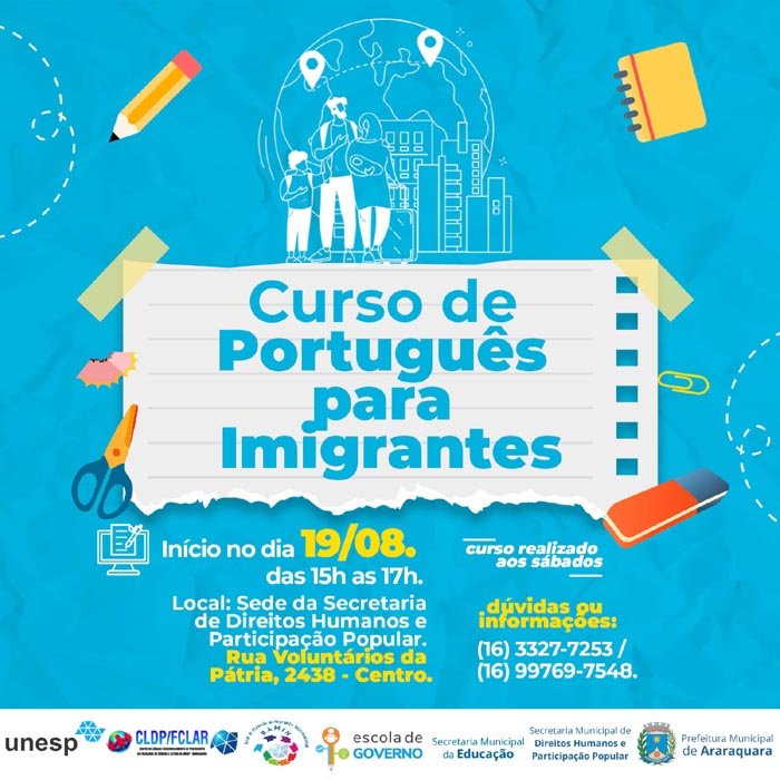 A Prefeitura de Araraquara segue com as matrículas para o Curso de Português para Imigrantes, que contará com aulas aos sábados, das 15h às 17h, com início no dia 19 de agosto, na sede da Secretaria de Direitos Humanos e Participação Popular, localizada na Rua Voluntários da Pátria, 2.438, Centro. A atividade é realizada por meio de uma parceria entre Escola de Governo, Secretaria Municipal da Educação, Secretaria Municipal de Direitos Humanos e Participação Popular, Unesp, Rede de Atenção ao Migrante Internacional e o Centro de Línguas e Desenvolvimento de Professores da Faculdade de Ciências e Letras da Unesp Araraquara.