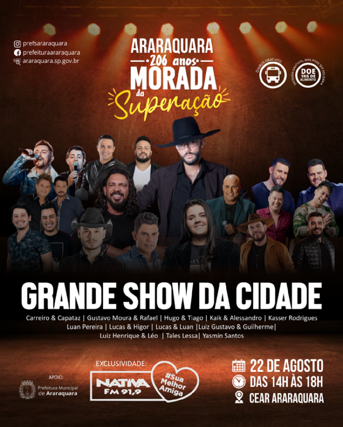 Rádio Nativa – Aquele showzão cheio de sucessos da rádio, com muito carinho entre ídolos e fãs, abre a programação musical no aniversário da cidade, em uma promoção da Rádio Nativa, especialista em música sertaneja, com o apoio da Prefeitura de Araraquara.