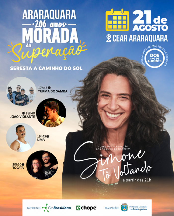 Turma do Samba, João Violante, Lima, Tocaya e Simone são os convidados da Secretaria Municipal da Cultura e Fundart para os shows, que trazem repertórios diferentes para animar toda a família araraquarense: samba, sertanejo, música preta e MPB – todos com muita qualidade musical para comemorar os 206 anos de Araraquara.