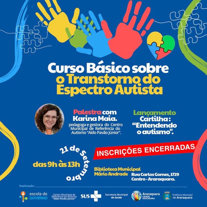 Com todas as vagas preenchidas em menos de uma semana, o curso básico sobre o Transtorno do Espectro Autista tem suas inscrições encerradas. A capacitação será realizada no dia 21 de setembro, uma quinta-feira, das 9h às 13h, na Biblioteca Municipal "Mário Andrade", na Rua Carlos Gomes, 1729, Centro.