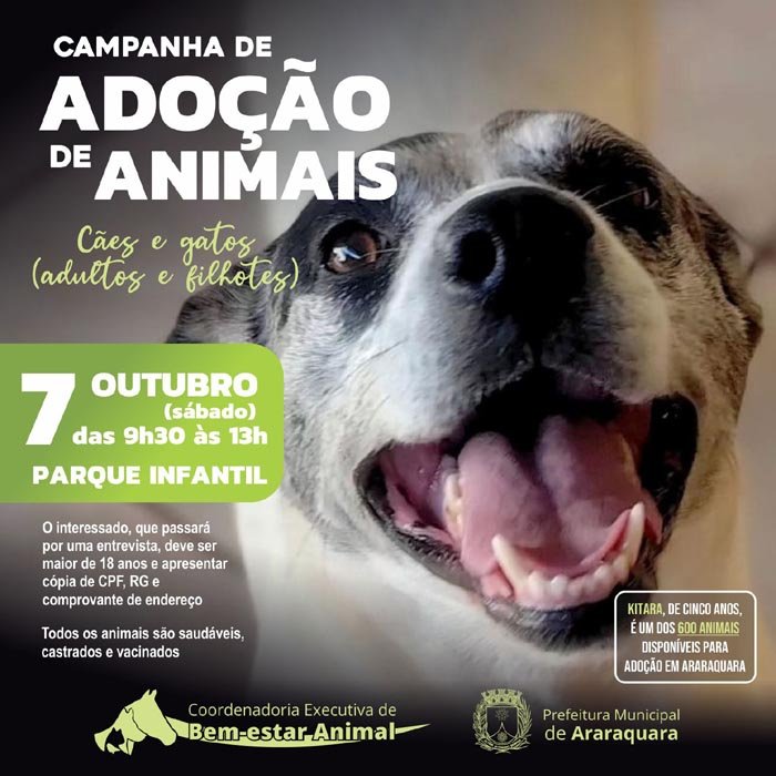 Neste sábado, 7 de outubro, das 9h30 às 13h, o Centro de Adoção Permanente Cão Gabriel, localizado no Parque Infantil, receberá mais uma edição da Campanha de Adoção de Animais. A ação é realizada pela Prefeitura Municipal de Araraquara por meio da Coordenadoria de Bem-Estar Animal da Chefia de Gabinete. Vale salientar que, se chover, a campanha terá sua data remarcada.