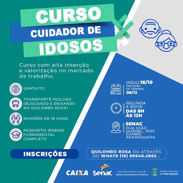A Prefeitura Municipal de Araraquara, por meio da Secretaria Municipal de Desenvolvimento Urbano, em parceria com a Caixa Econômica Federal e o Serviço Nacional de Aprendizagem Comercial (Senac), abriu inscrições para o curso de cuidador de idosos, que será oferecido gratuitamente no próprio Senac, localizado na Rua João Gurgel, 1935, Carmo. Este curso profissionalizante se insere no âmbito do programa de Pós-ocupação da Zona Norte de Araraquara.